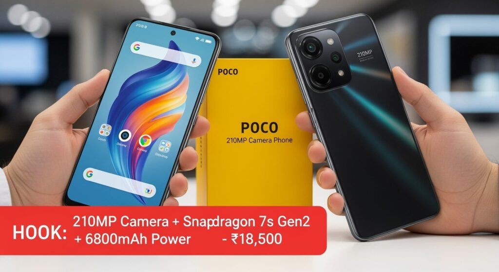 Poco का 210MP Camera Phone: मैं आज आपको एक ऐसे स्मार्टफोन के बारे में बताने वाला हूँ जो बाजार में तहलका मचाने के लिए तैयार है। Poco का 210MP Camera Phone – ₹18,500 में Snapdragon 7s Gen2 + 6800mAh Power के साथ आ रहा है। क्या आप कल्पना कर सकते हैं कि इतनी कम कीमत में इतना शक्तिशाली फोन? चलिए इसके बारे में विस्तार से जानते हैं।
